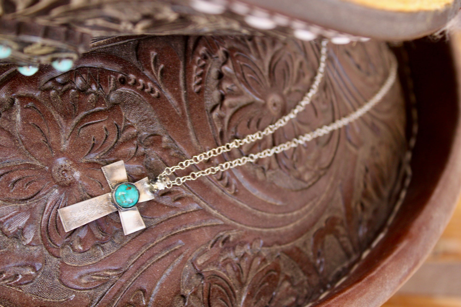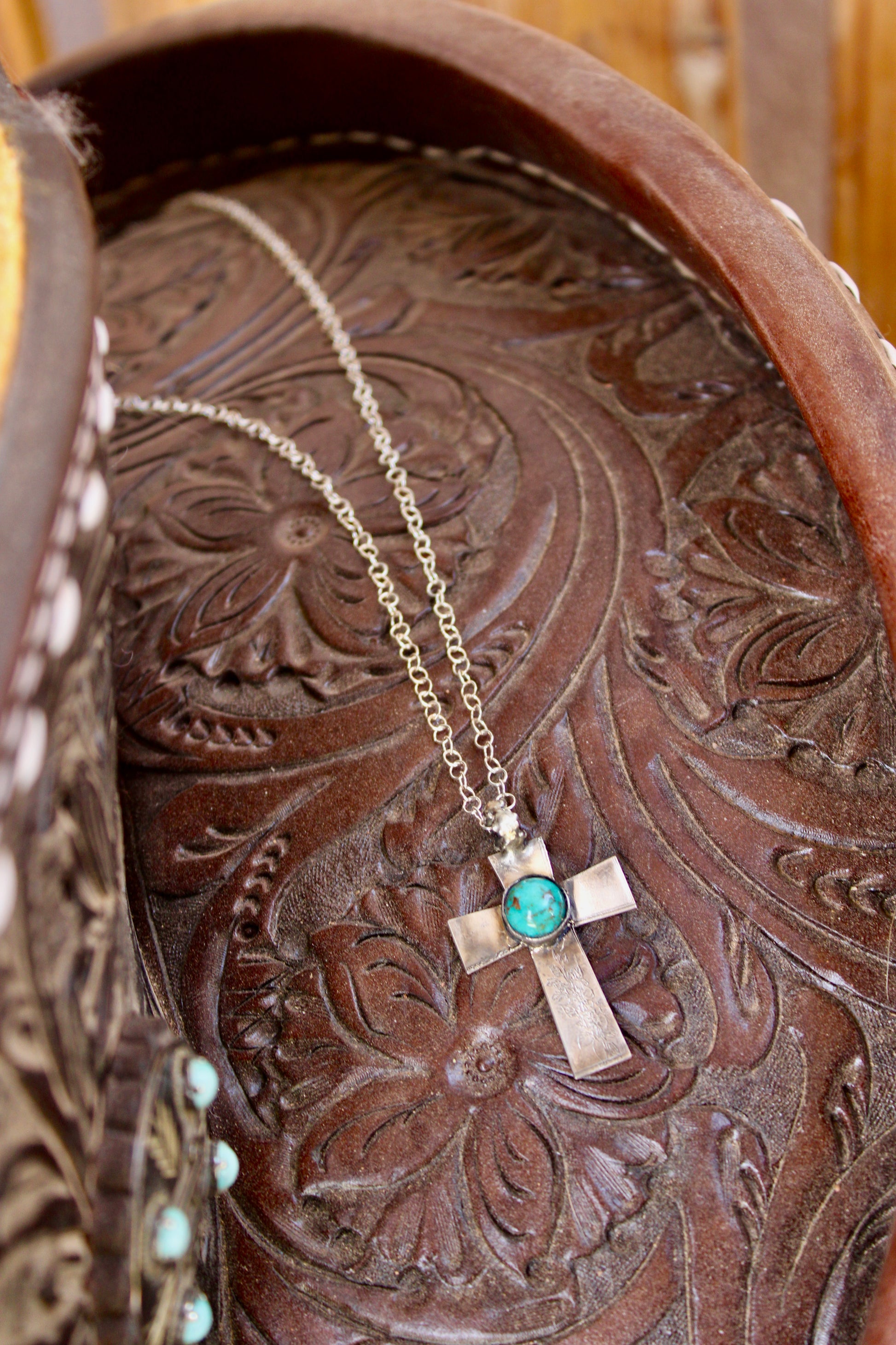 This handcrafted sterling silver cross necklace features a vibrant turquoise stone, bringing together western soul and timeless faith. Set on an 18” sterling silver chain, it’s stamped with our H&H Silver Co. maker’s mark and “sterling” for authenticity.