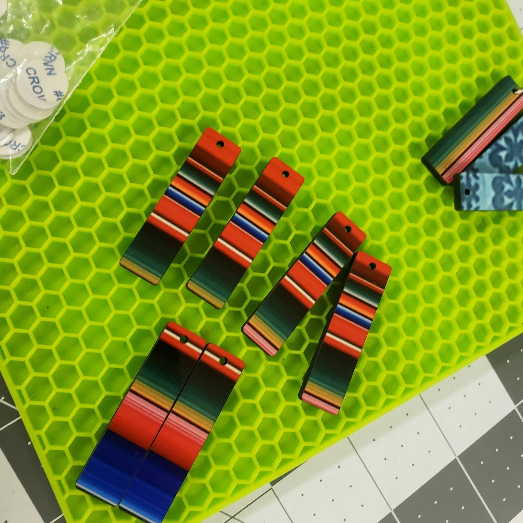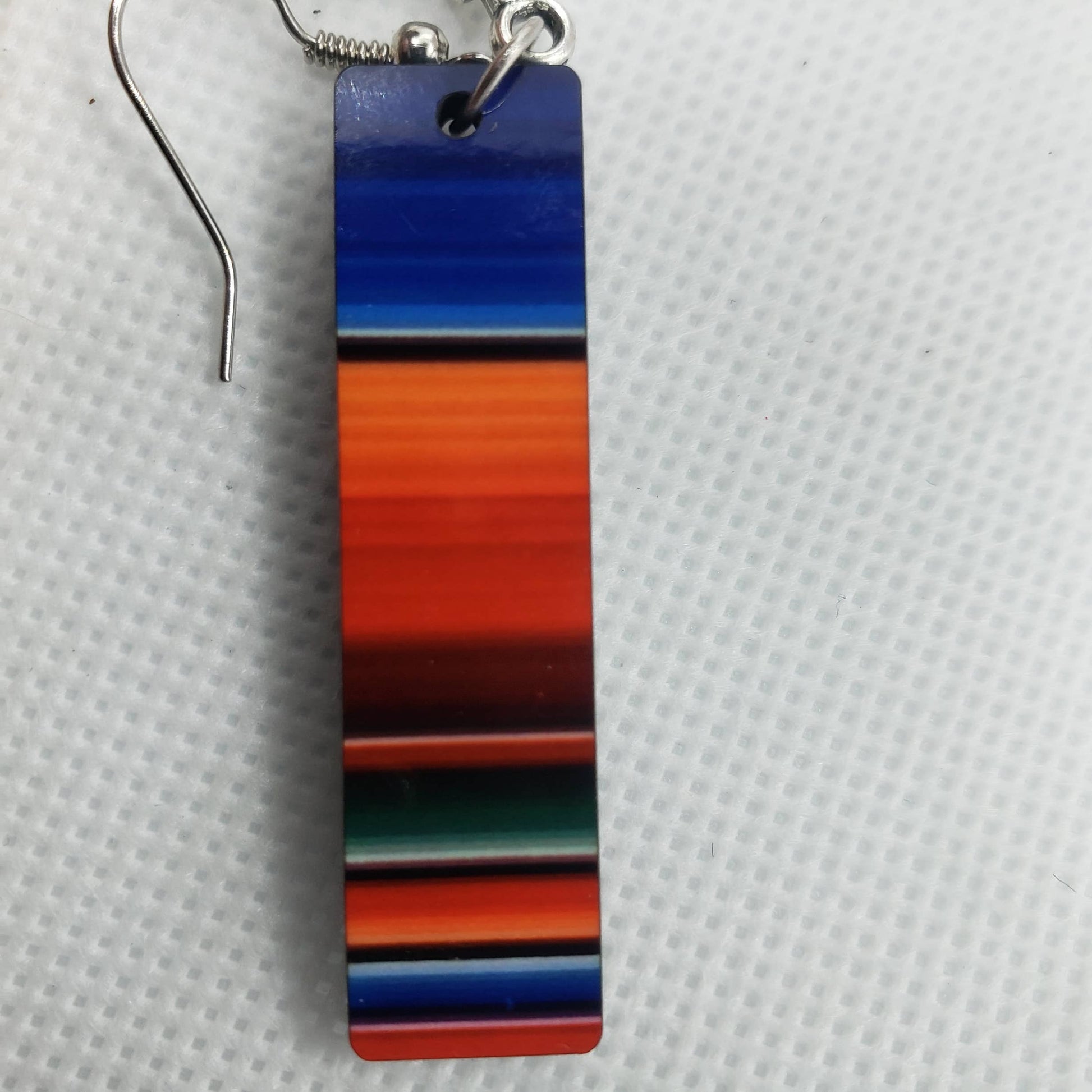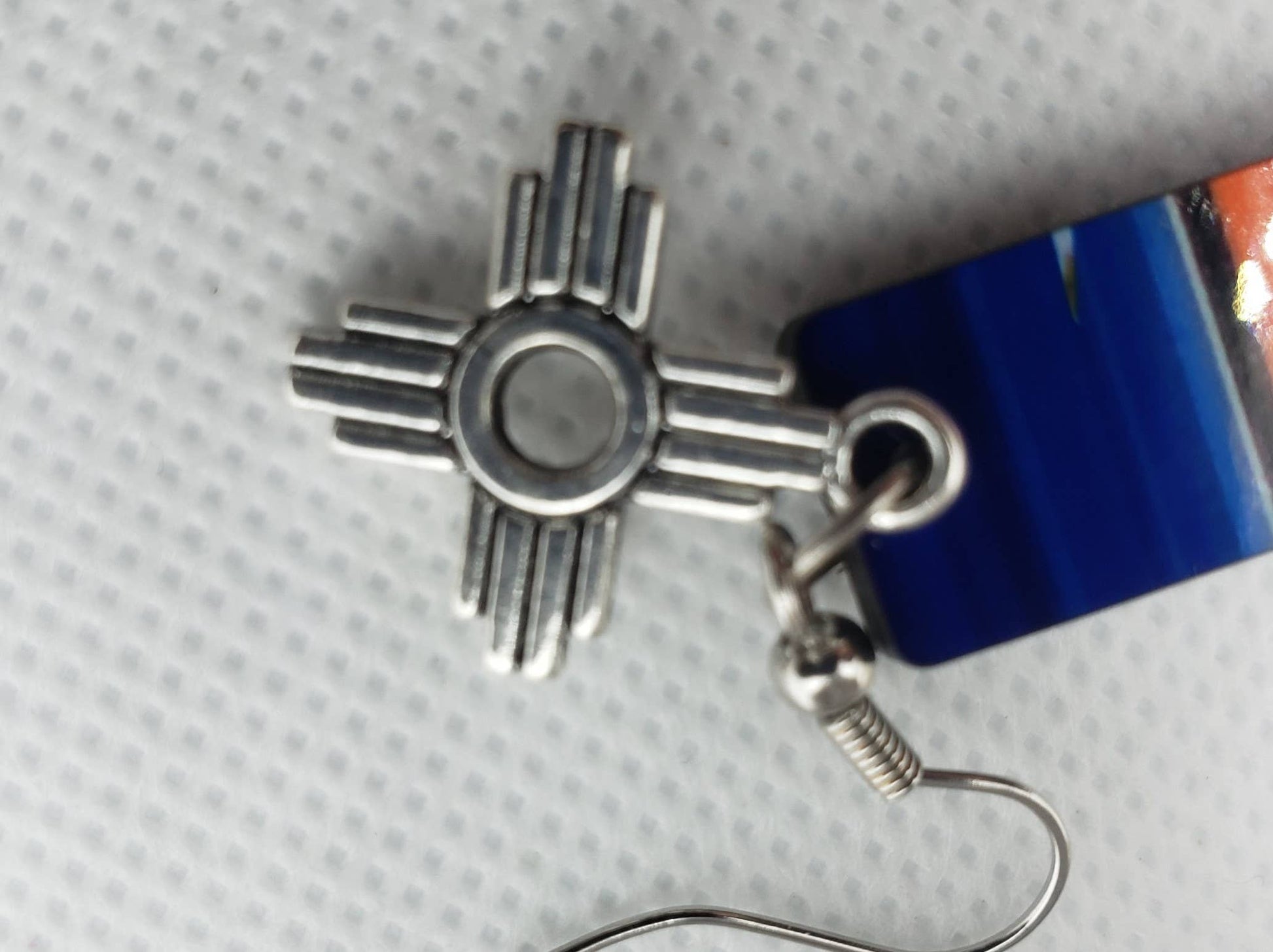 Zia Serape Earring. Serape is printed onto wood blank and stainless zia charm is added. True feel of the Southwest with these 2 inch dangle earrings. The earrings are very lightweight and go with almost anything. Bright, cheerful, cute earrings your customers will love. Necklace also available.